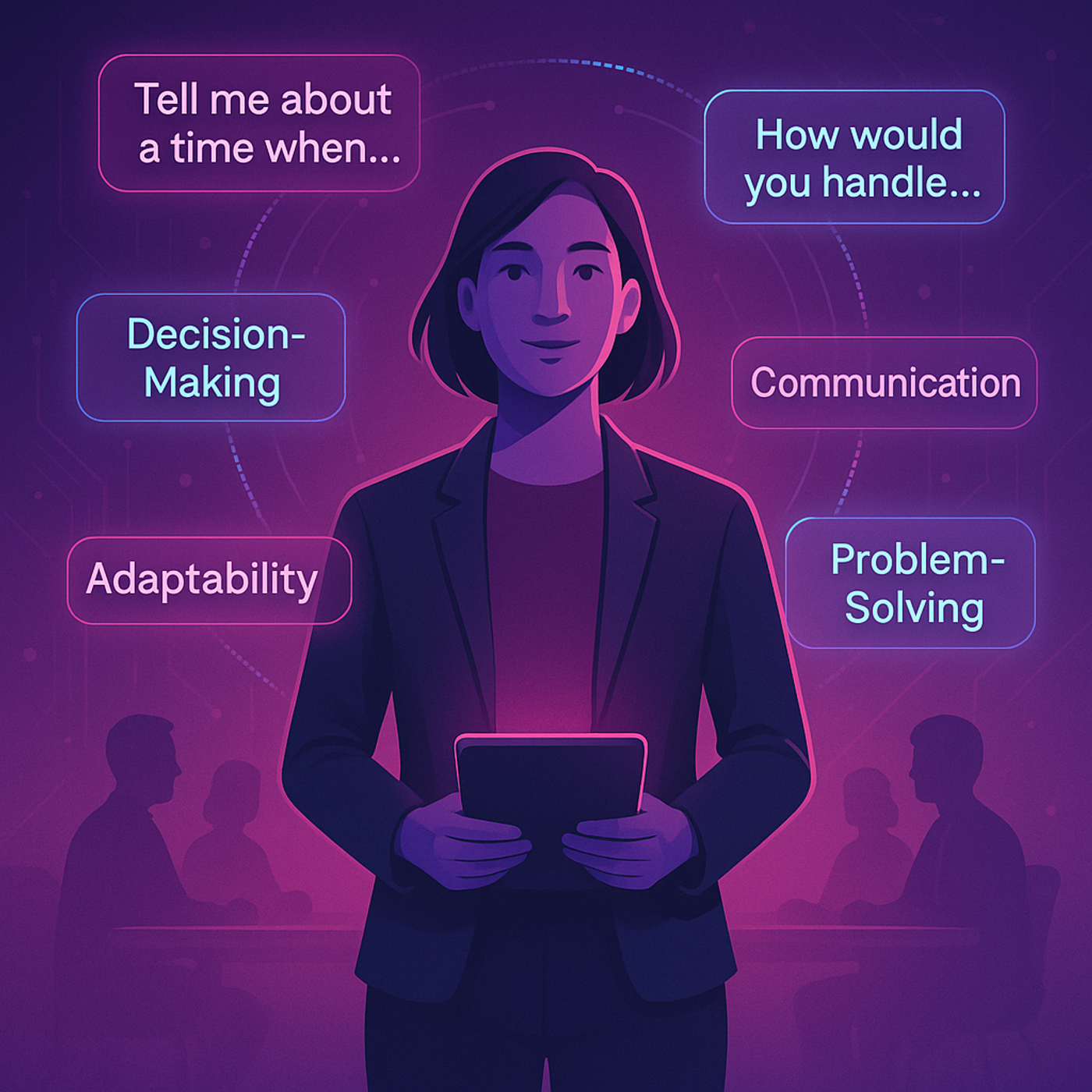 The job seeker (realistic proportions) sits focused and confident, holding a tablet or stylus to symbolize active engagement and precision.